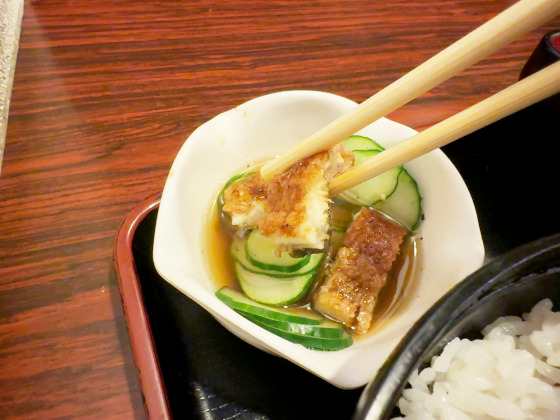早速、鰻にかぶりつきます。ご飯に乗った鰻は二切れ。鰻自体は割と細め、焼きはかなりしっかりと火が入ってカリッとした食感が強いです。鰻自体の風味は弱く感じますが、タレがさっぱりとした甘さで絶妙に盛り立てています。それにしても、客と店員が創り出す活気が心地よく、料理を美味しくする最高のスパイスに感じられます