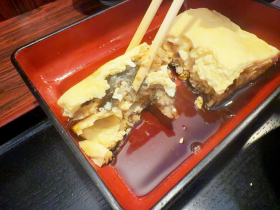 焼きたてのう巻きはアツアツ、箸を入れるとふわっと崩れるほどに柔らかい。卵の甘みと鰻の濃い目の味のコントラストがたまりません
