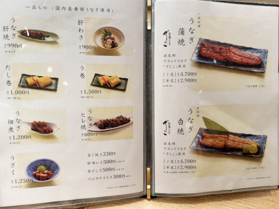 食後に提供される温かいほうじ茶を飲みながら他のメニューを眺めてみます。白焼や肝焼もあり