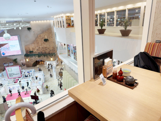 席はこんな感じ。窓際だと階下が見渡せて解放感があります。ちなみに土曜日の13時30分頃で3組ほど待ちがあり、待つこと10分程で案内されました。