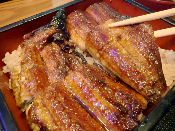 鰻は頭付きで豪華です。身はけっこう分厚い。タレの照りが強め。