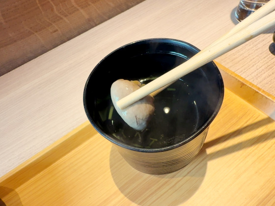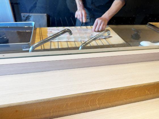 店内はカウンター席。木目調の机は高級感あり。店内は外国人客が多く、インバウンドに人気のお店なのかも。なお、昼は予約をとっていないとのこと。土曜日の12時に行くと2組の先客、後からも1組来ていました。