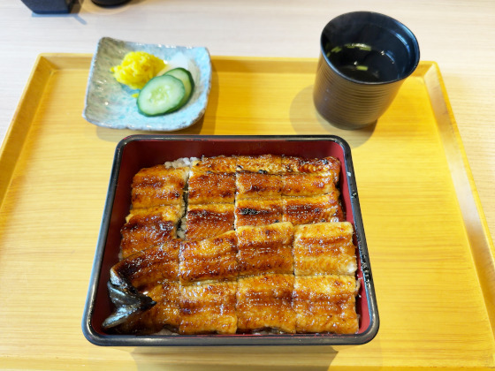 完成です。提供まで約30分ほど。やはり目の前で焼かれると食欲がそそられます。こちらは「うな重【並】(三河産1尾)(4,800円)」です。肝吸いと漬物がセットになっています。