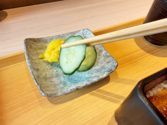 時々、漬物をぽりぽり。ちなみにご飯にはタレがかかっておらず自分で好みでかけることもできます。「ご飯は何もかかっていないのが好き」という蒲焼スタイルの人にも喜ばれそう。もちろんこの漬物でご飯を食べる選択肢も十分あり