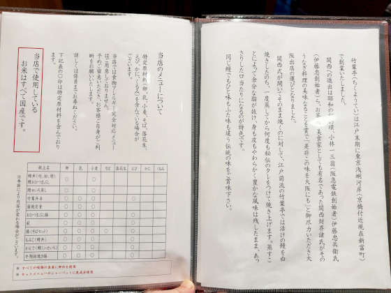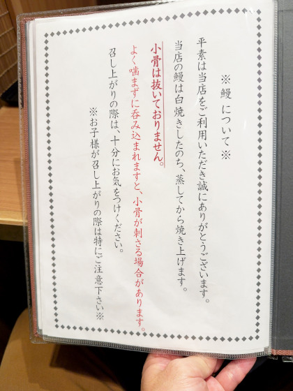 メニューを開いてみます。小骨は抜いていないとのこと。割と年配の客が多かったので、そのための注意書でしょうか