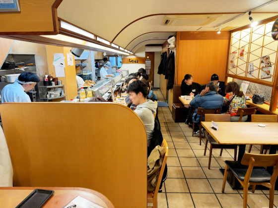 受付簿に名前を書いてしばし待機。店内はカウンターとテーブルがあります。二階席もあるようでした
