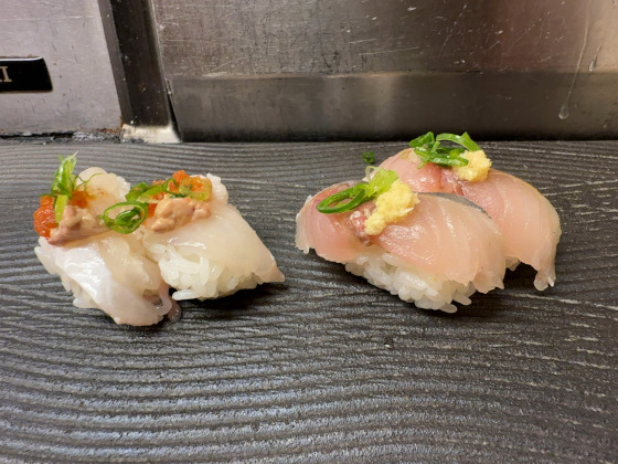 注文を済ませて待つこと20分ほどで、最初の鮨が登場。とりあえずカワハギ(2貫 税抜600円)とアジ(2貫 税抜200円)でまずは腹ごしらえ。う、うめぇ……