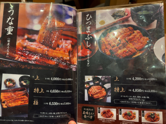 鰻はうな重、ひつまぶしがあります。周りにはひつまぶしを注文している人もちらほら。なお、うな重のメニューが「上」から始まるのはありがたい心遣い。「並」と言うより「上」と言った方が鰻は旨く感じるものです