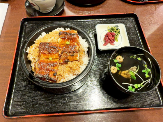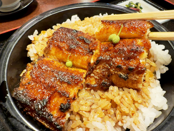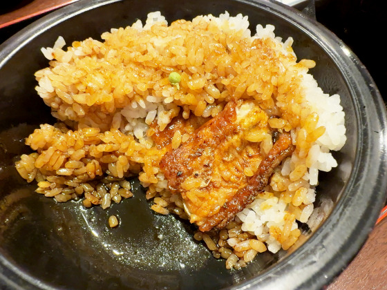 上の場合は鰻は1/2尾で、蒲焼がご飯の上に2枚、ご飯の中に1枚という配分。ご飯の間で鰻を蒸すいわゆる「まむし」が楽しめます。それにしてもタレはめちゃくちゃたっぷりとかかっているので、タレ党の人にはたまらない内容。甘さは控えめで醤油味が強めに感じられます。
