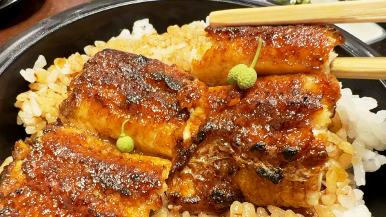 上の場合は鰻は1/2尾で、蒲焼がご飯の上に2枚、ご飯の中に1枚という配分。ご飯の間で鰻を蒸すいわゆる「まむし」が楽しめます。それにしてもタレはめちゃくちゃたっぷりとかかっているので、タレ党の人にはたまらない内容。甘さは控えめで醤油味が強めに感じられます。