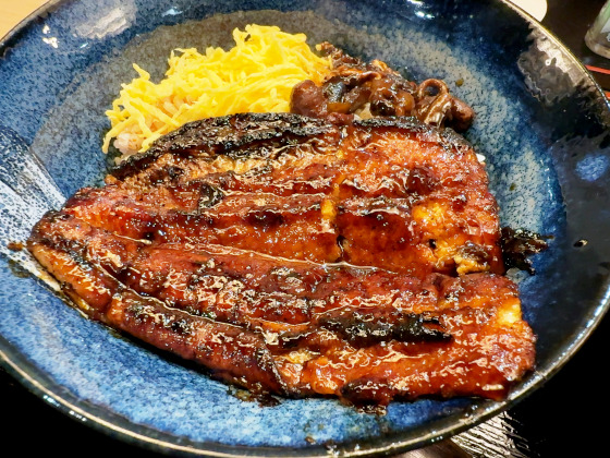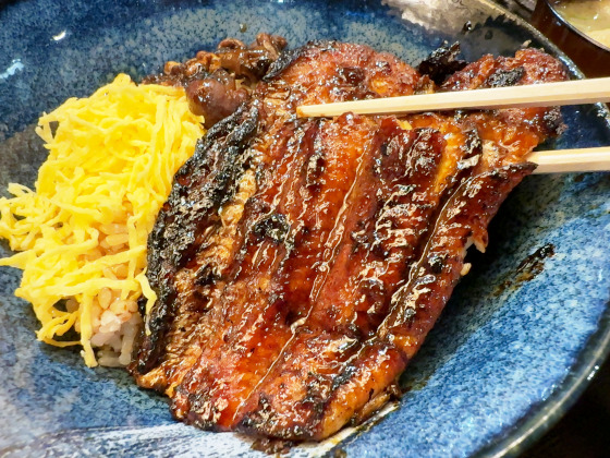 鰻は愛知県産。肝焼きと錦糸卵が乗って豪華です。見るからに濃そうなタレがたっぷりと塗られています
