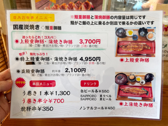 メニューは国産鰻を使用したものがメイン。他の店と比べると色々と付いているのにとにかく安い。ただ、ビールは缶ビールで550円とちょっと高め