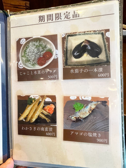 ご馳走様でした。一気に食べてしまった……余韻に浸りながら次回のために他のメニューも予習しておきます。メニューには期間限定品もあります。アマゴの塩焼きは奥の水槽で泳いでいるのが見えたので、新鮮そのもの