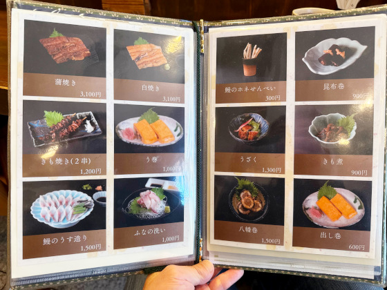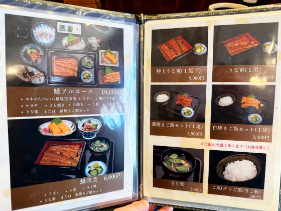 メニューはうな重が中心。特上うな重でも5000円とかなり安い。肝吸いは別売り
