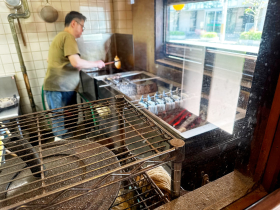 注文を済ませて焼き場を小窓から覗いてみました。大将が焼いているところです。注文が入ってから焼き上げていくみたい。炭火で焼かれる匂いで食欲を刺激しまくり、この景色を目で楽しむのが鰻をよりおいしく食べる秘訣