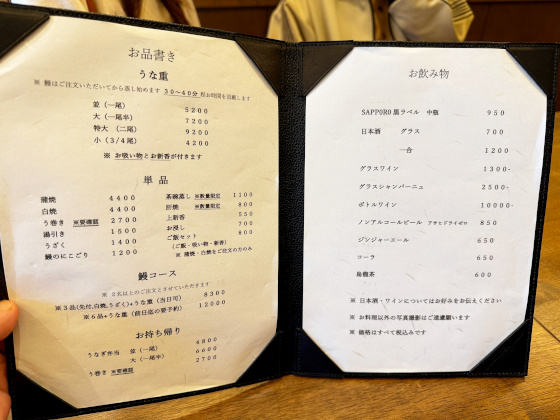 メニューはこんな感じ。値段設定は一般的な鰻屋より少々高め。単品の鰻重の他、コース料理もあります。今回は「鰻コース(税込8,300円)」を注文。妹親子が一緒にいたので、かっこいいところを見せようと奮発しました……。先付、白焼き、鰻重(通常の3/4サイズ)という内容です。ちなみに瓶ビールは税込950円。