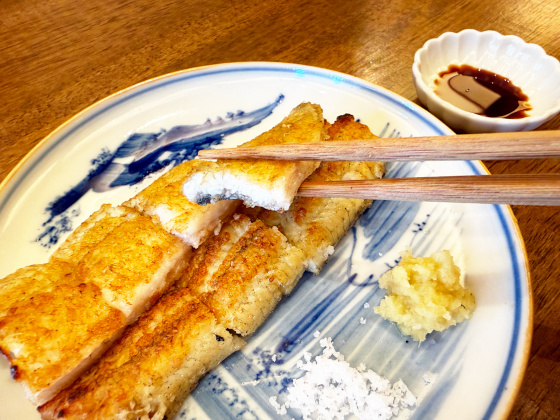 さらに待つこと15分ほどで白焼きの登場。白焼きは鰻の風味が一番分かる食べ方で、川魚らしい力強くも軽やかな風味がよく出ています。そのままで食べても美味しく、また塩、わさび醤油と味変しながら楽しめるのがグッド。ところで……じっくりと作りこんで時間をかけて提供されるスタイルなのでワインなどお酒を注文してちびちびやりながら楽しむのがこのお店で一番合っている楽しみ方のようです。
