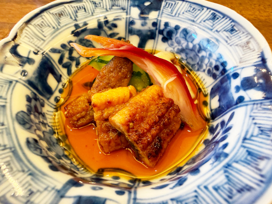 待つこと15分ほど、鰻コースの最初の一品目はうなぎの煮凝りと肝焼き